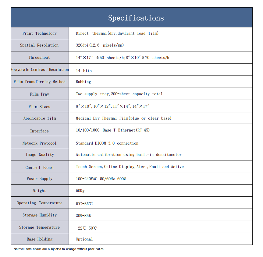 The BX-460DY Dry Imager is a thermo-graphic film processor designed to copy and send images through DICOM network protocol. It uses the latest direct dry thermal imaging technology which accommodates for a full range of modalities including CT, MRI, DR, CR, Digital Gastrointestinal, Nuclear Medicine, Mobile X-Ray Imaging, and Dentistry, etc. The HQ-Series Dry Imager dedicates to precision in diagnosis with its outstanding image quality,and offers affordable imaging catering to your needs.